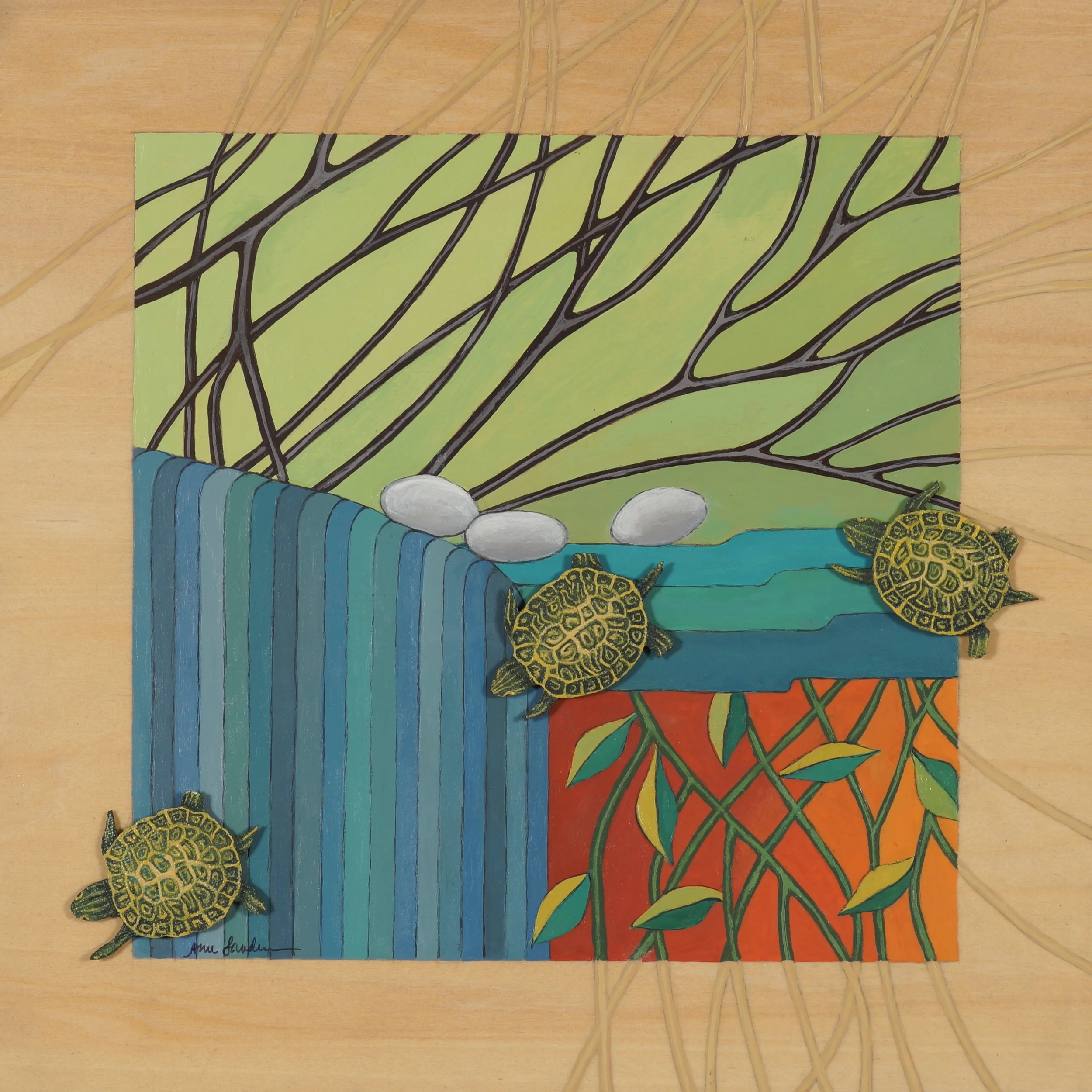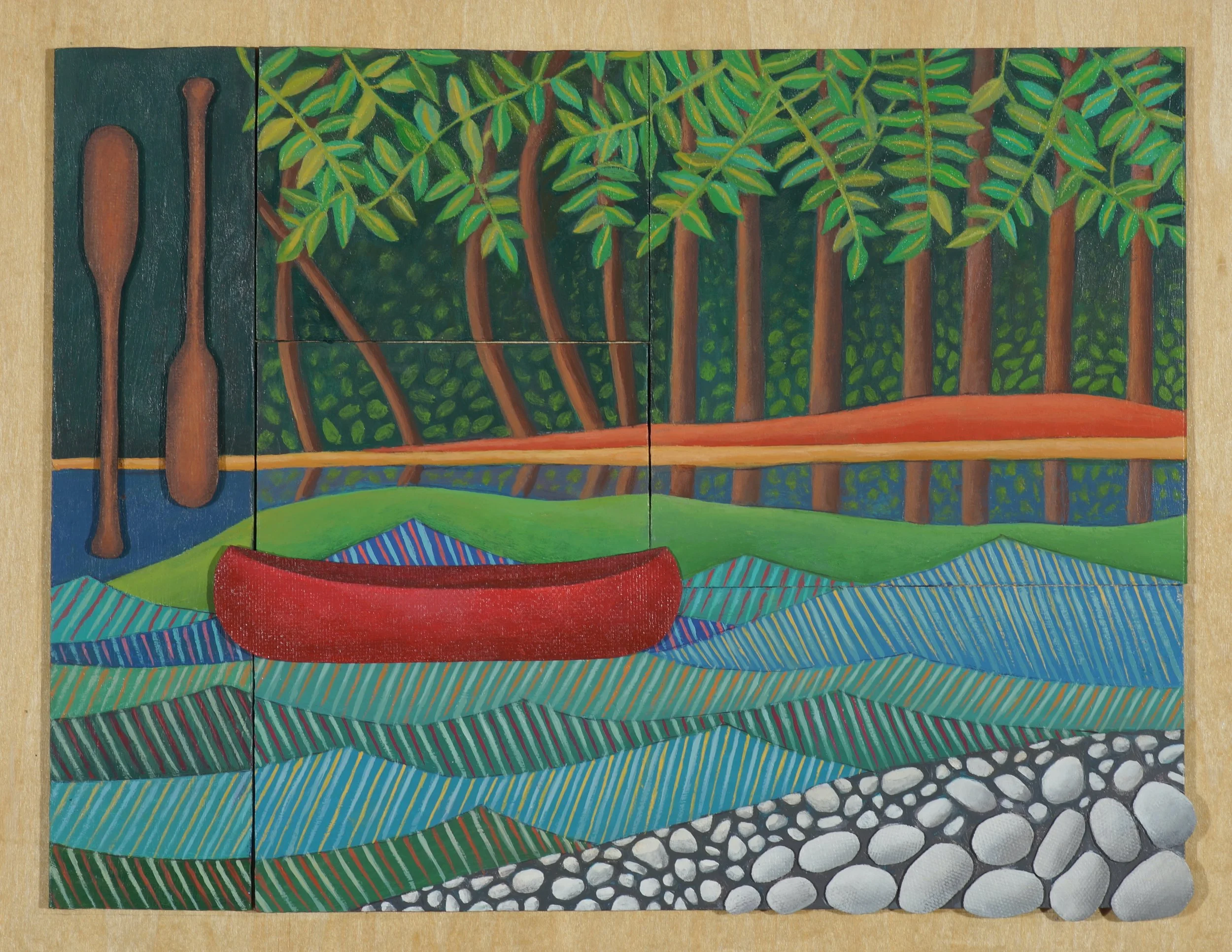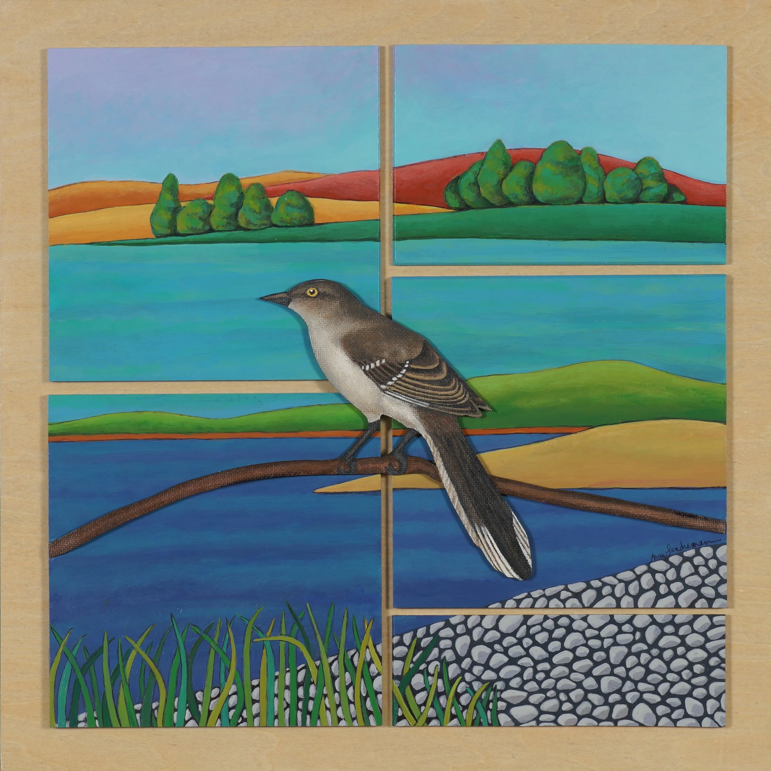 Nature provides a mixture of images that are both simple and complex. Within my paintings I juxtapose the simplicity of a branch or sky with the intricate design and patterns found in rocks, water, flora and fauna. My paintings are intentionally segmented. That allows the viewer to peer in and examine closely the variety of lines and forms found in nature. Linking these segments also encourages the viewer to look out and reflect upon the interdependence of natural elements such as trees, rivers, birds, fish, skylines and landscapes. I love repetition and patterning which connect to both realistic and abstract forms found in the natural world.